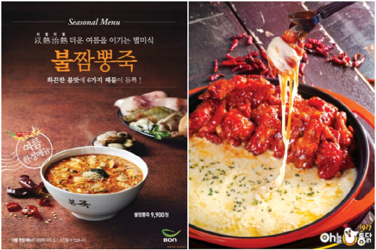 외식업계의 여름철 '이열치열'마케팅이 한창이다. 11일 업계에 따르면 본죽은 화끈한 불맛을 강조한 여름 한정 메뉴 '불짬뽕죽'을 새롭게 출시했다. 불짬뽕죽은 부드러운 일반 죽과는 달리 매운맛을 강조한 여름철 별미 메뉴다. 건강에 좋은 쭈꾸미, 새우, 오징어, 굴, 바지락, 소라 등 6가지 해물을 듬뿍 넣었으며 짬뽕의 풍미를 살리기 위해 불맛을 더했다.