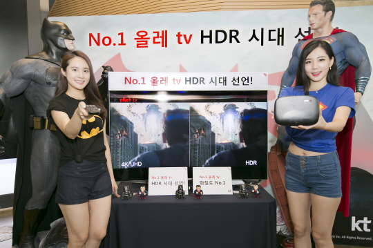한편 KT는 HDR을 지원할 수 있는 셋톱박스를 개발?적용, 우선 워너브라더스와 영화 '배트맨 대 슈퍼맨: 저스티스의 시작', '매드맥스: 분노의 질주' 2편의 HDR 전용 콘텐츠를 선보인다. 연말까지 워너브라더스 등 다양한 콘텐츠 공급자와 협력해 65편의 HDR 콘텐츠를 IPTV 서비스로 제공할 계획도 세웠다.