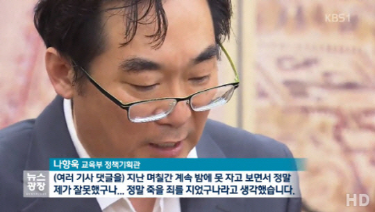 한편 지난 11일 국회에 출석한 나향욱 기획관은 "취중에 발생한 일로 본심이 아니다. 공무원으로서 절대 해선 안될 부적절한 말을 했다. 진심으로 죄송하고 사죄드린다. 죽을 죄를 지었다. 제 불찰이다"라며 울먹이기도 했다.