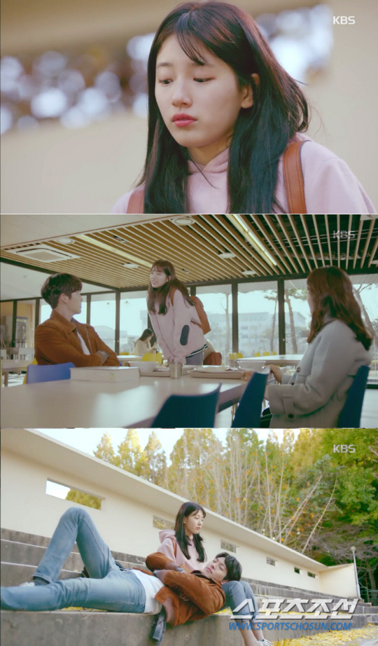 대학생들의 영원한 베스트 아이템 후드도 귀엽게 연출할 수 있다. 딱 맞게 입는 것 보다는 슬리브가 손목 아래로 살짝 내려 오게 입는 것이 포인트. 이 때 후디는 파스텔 계열을 선택해 가을의 강렬한 계절 색채에 부드러운 인상을 남길 수 있도록 하는 것! 그리고 팔꿈치 부분에는 보색의 패치를 덧대어 귀여움을 한층 더 강조했다. 후드와 함께 매치할 하의는 바로 데님! 데님의 클라스는 언제나 영원하다는 점을 잊지말자! 어떤 상의와 매치해도 패셔너블하게 연출할 수 있다는 사실. 수지는 하프 스키니 보이프렌드 팬츠를 살짝 롤업한 뒤 스니커즈를 매치해 가벼운 느낌의 경쾌함을 더했다. 박시한 후디와 핏 좋은 데님팬츠는 여름을 제외하고는 언제든 꺼내 입을 수 있는 베이직한 아이템으로 좋은 소재로 하나 마련해두면 두고두고 입을 수 있으니 참고할 것!