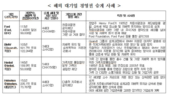 미국 포드의 경우 포드재단에 대한 주식(보통주)출연과 차등의결권 주식 발행을 통해 상속세 부담을 완화하는 동시에 경영권을 유지했다. 차등의결권은 경영진이나 최대주주에게 보유 지분율보다 더 많은 의결권을 부여해 경영권 안정을 도모하는 제도다. 현재 미국, 일본 등은 차등의결권 제도를 도입하고 있지만 우리나라는 허용하지 않고 있다.