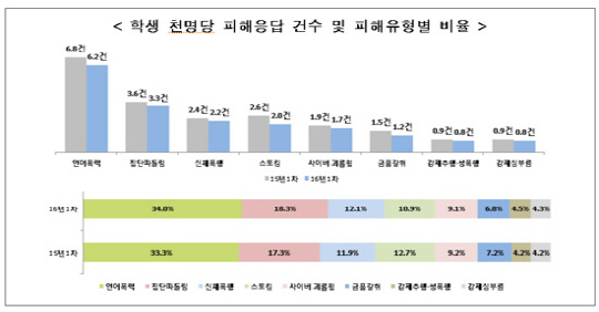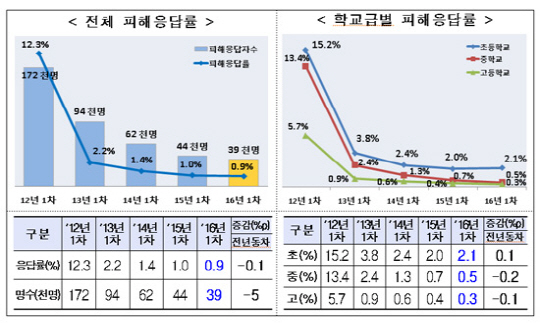 피해를 당했다는 학생 비율은 초등학교 2.1%(2만6천400명), 중학교 0.5%(7천100명), 고등학교 0.3%(5천200명)로 나타났다.