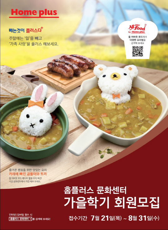 홈플러스 문화센터는 21일부터 가을학기 회원을 모집한다고 19일 밝혔다. 홈플러스에 따르면 가을학기 강좌는 캠핑요리를 비롯해 홈플러스에서 구매 가능한 상품 브랜드와 연계한 콜라보 강좌, 건강을 챙기기 위한 운동 강좌 등이 진행된다. 가을학기 강좌는 9월 1일부터 11월 30일까지 진행하며, 접수(선착순 마감) 및 강좌 관련 자세한 사항 확인은 홈플러스 문화센터 홈페이지ool.homeplus.co.kr) 및 매장 내 문화센터 안내데스크를 통해 확인 가능하다.