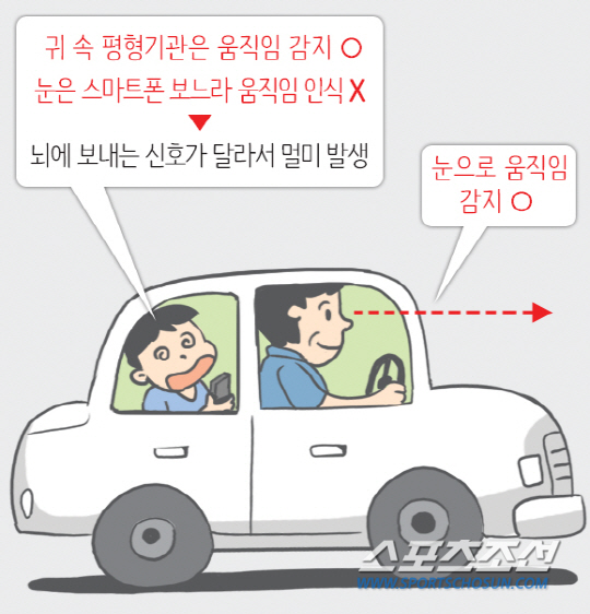 달리는 차 안에서 귀 속 평형기관은 '움직임'을 감지하지만, 눈은 책이나 스마트폰 등을 보느라 움직임을 인식하지 못하는 경우가 많다. 따라서 평형기관과 눈이 뇌에 보내는 신호가 다르기 때문에 혼란이 생겨 멀미가 나게 된다. 그러나 운전자는 차 밖을 주시하기 때문에 눈으로도 도로 사정이나 정지·출발 등 움직임을 잘 감지할 수 있어 멀미가 덜하다. 이는 배 등 다른 교통 수단을 운전하는 사람들에게도 모두 해당되는 원리다. 반대로 흔들리는 배나 놀이기구를 탄 후 고정된 땅에 발을 내딛을때 '휘청'할 수 있는데, 이는 움직인다고 느꼈는데 갑자기 정지되면서 감각의 혼란이 오기 때문이다.