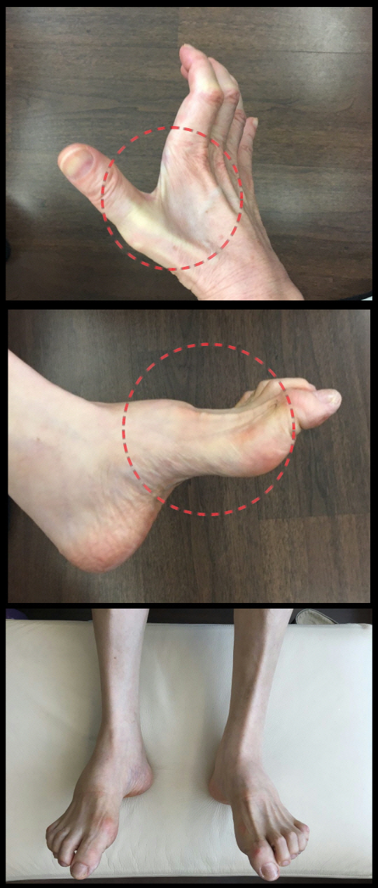 사진에서 CMT가 진행돼 엄지와 검지손가락 사이 근육이 모두 빠지고 손가락이 굽어버린 손, 근육위축으로 발등이 솟아오르고 발가락이 굽은 발, 뼈만 남은 듯한 앙상한 종아리 모습을 확인할 수 있어 샤르코-마리-투스병으로 추정된다.