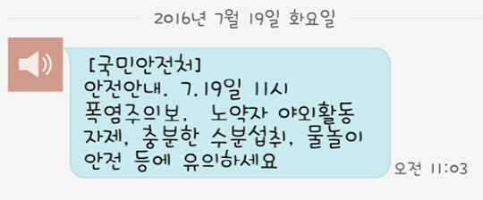 폭염주의보에 국민안전처도 안전안내 문자를 발송했다. 국민안전처는 노약자 야외활동 자제, 충분한 수분섭취, 물놀이 안전 등에 유의하라고 당부했다. <스포츠조선닷컴>