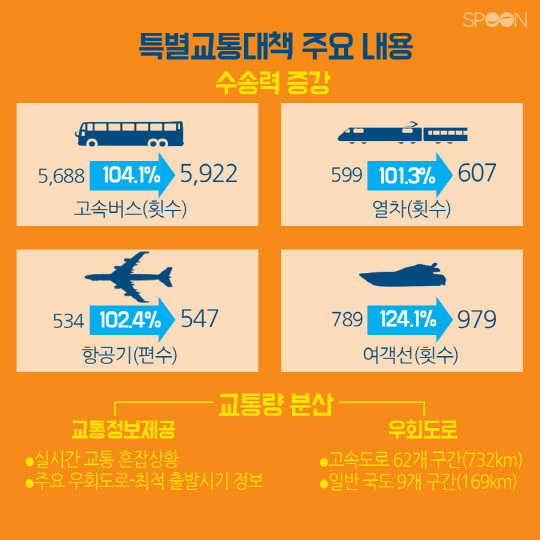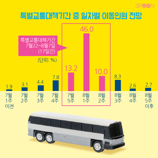 지난 19일 국토교통부는 오는 7월 22일부터 8월 7일까지 17일간을 하계 휴가철 특별교통대책기간으로 정한다고 밝혔습니다. 올 여름 휴가철엔 7월 30일~8월 5일 중 전체 휴가객의 46.0%가 몰리고, 7월 30일~7월 31일에 고속도로 혼잡이 가장 심할 것으로 예상했습니다. 특별교통대책기간 동안 하루 평균 고속버스 234회, 철도 8회, 항공기 13편, 선박 190회를 늘리는 등 대책을 시행하기로 했는데요… 국토교통부의 교통수요 분석 및 주요 특별교통대책 내용을 그래픽으로 살펴보았습니다. 김변호 기자 bhkim@sportschosun.com