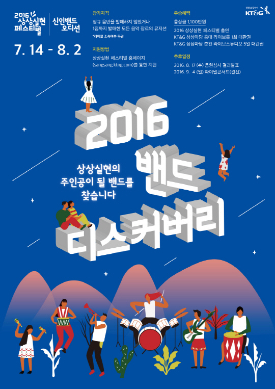 전문가 평가와 네티즌 추천으로 6팀이 1차로 선발되며, 오는 9월 4일 KT&G 상상마당 라이브홀에서 열리는 파이널 콘서트에서 최종 3팀이 선정된다.