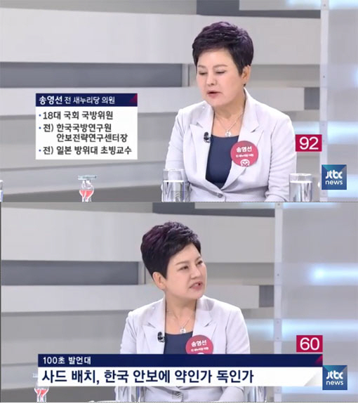 21일 중국 최대포털 바이두와 홍콩 봉황망 등은 지난 16일 방송된 JTBC '밤샘토론-사드배치, 한국 안보에 약일까, 독일까?'에 출연한 송 전 의원의 발언을 소개했다.