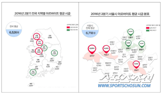 올 2분기 서울지역 아르바이트 전체 평균시급은 6718원으로 법정 최저임금 6030원보다 688원, 전국 평균인 6526원보다는 192원 많은 것으로 나타났다.
