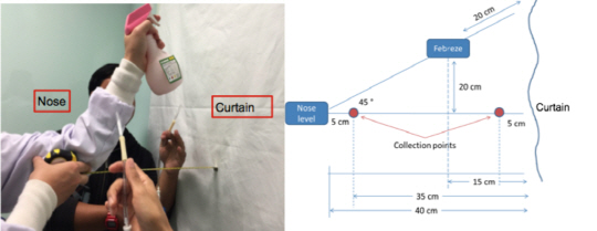 예를 들어 통상 소비자들이 옷에 페브리즈를 뿌린다고 했을 때, 45도 각도로 여러 곳에 나눠서 3번 정도 분사한다.이 때 코에서 5cm 위치에서부터 분사된성분을 분석하는데 분사하는 것과 동시 그리고 1,2,3분 후 공기 중에 성분에 얼마나 남아 있는지를 측정해 분석하게 된다.