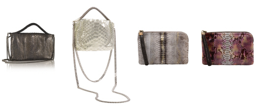클러치 백은 좀 더 화려한 느낌을 살린 제품으로 골드 포인트가 들어간 그레이와 바이올렛 컬러로 선보인다. 천연 뱀피 가죽 특유의 화려한 패턴이 특징으로 파티, 모임 등 각종 행사에서 돋보이는 스타일링을 연출할 수 있다. 손목에 걸 수 있는 손잡이 끈이 달려있어 들기 편하다.