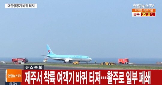 대한항공 항공기가 제주공항에 착륙 중 앞바퀴가 터져 활주로가 한때 폐쇄됐다.