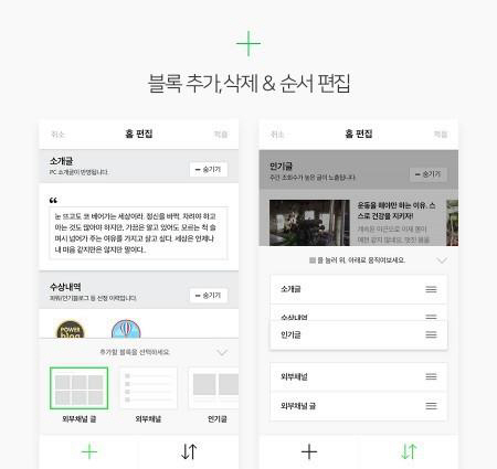 네이버는 또 모바일 블로그 커버를 구성하는 5개의 블록-외부채널글, 외부채널 목록, 인기글, 소개글, 수상내역-의 노출 여부 및 노출 순서도 이용자가 직접 설정할 수 있도록 했다.