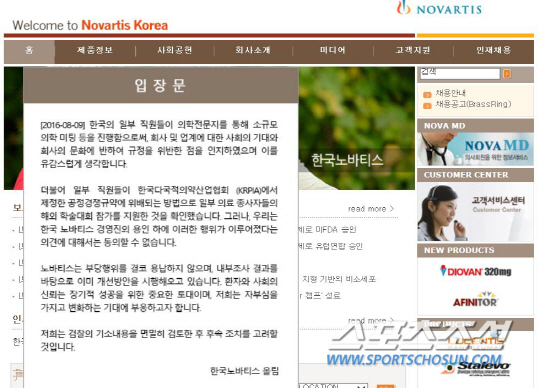 이 같은 사실이 전해지자 한국노바티스는 즉각 '입장문'을 내고 "'유감스러운 일'이 '경영진의 용인 하에 이뤄졌다는 의견에 동의할 수 없다'"며 "'한국의 일부 직원들이 규정을 위반한 일'"이라고 검찰의 발표를 정면으로 반박했다. 이어 "이번 검찰의 기소 내용을 면밀히 검토한 후 후속조치를 취할 것"이라고 덧붙였다. 이번 리베이트 사건은 일부 직원의 일탈로 한국노바티스와는 관련 없다는 행태에 일각에서는 '꼬리 자르기 수법'이라는 비난도 나오고 있다. 노바티스는 입장문을 통해 "부정행위를 결코 용납하지 않으며 환자와 사회의 신뢰는 장기적 성공을 위한 중요한 토대"라고 강조했다.