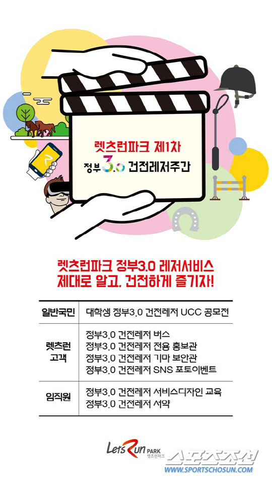 한국마사회는 8일부터 31일까지 '렛츠런파크 대학생 정부3.0 건전레저 UCC 공모전'을 개최한다고 밝혔다. 뿐만 아니라, 정부3.0 건전레저주간을 맞아 건전레저 버스, 건전레저 홍보관, 건전레저 SNS 포토이벤트 등 다양한 부대행사도 함께 선보인다.