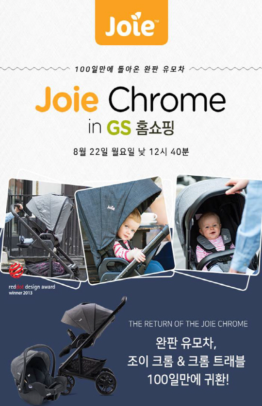 영국 프리미엄 유아용품 브랜드 조이가 초경량 디럭스 유모차 '크롬'이 22일 낮 12시 40분부터 GS홈쇼핑에서 3차 특별 방송을 진행한다고 16일 밝혔다.
