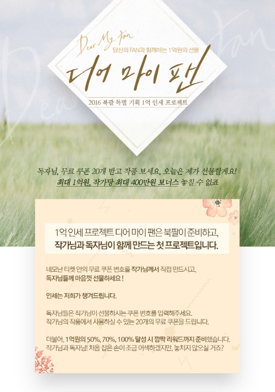 북팔 '디어 마이 팬'은 기존의 장르 문학 시장의 일방향적인 소통 방식에서 탈피, 콘텐츠 플랫폼의 특성을 100% 활용한 새로운 접근의 참여형 프로젝트로 작가 및 독자의 큰 기대를 모으고 있다. '디어 마이 팬'은 8월 16일부터 3개월간, 또는 실시간 누적 인세 1억원을 달성하는 시점까지 계속된다.