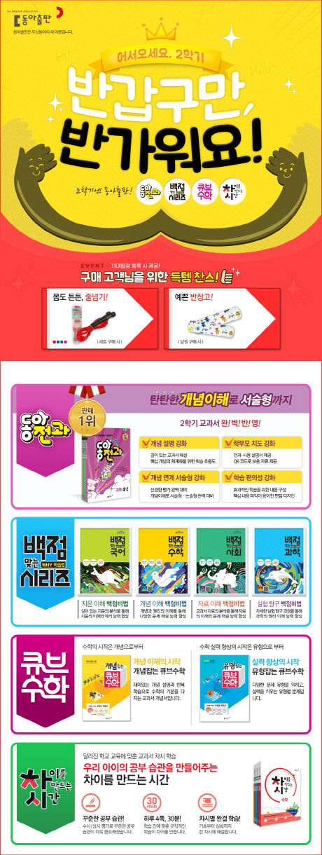교육출판전문기업 동아출판이 새학기를 앞두고 초등 교재 대상 온라인 서점 이벤트 '어서오세요 2학기'를 진행한다.