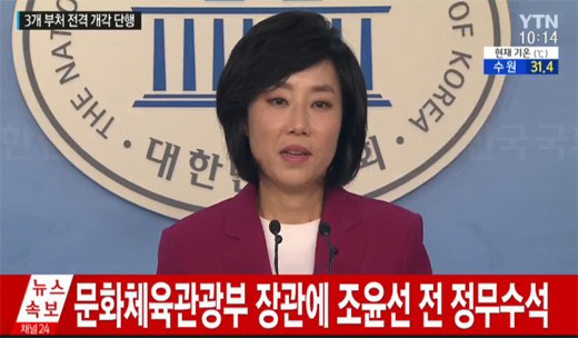 김성우 청와대 홍보수석은 이날 개각 발표 브리핑에서 "새 문화체육관광부 장관에 조윤선(50) 전 여성가족부 장관을 내정하는 등 3개 부처에 대한 개각을 단행했다"고 밝혔다.