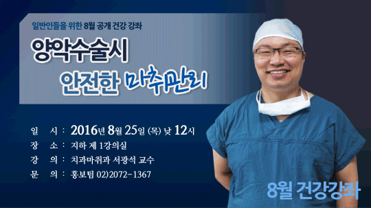 서울대학교치과병원(원장 허성주)은 25일 낮 12시 치과병원 지하 1강의실에서 '양악수술시 안전한 마취 관리'를 주제로 무료 공개강좌를 개최한다고 밝혔다.