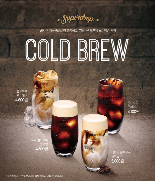 카페 드롭탑이 전국 220여개 매장에서 96시간 저온숙성한 '콜드브루 커피 2종'을 선보인다고 18일 밝혔다. 드롭탑에 따르면 신메뉴는 '콜드브루 플레인', '콜드브루 위드밀크(라떼)'로 지난 7월 출시한 '니트로 콜드브루2종'에서 질소를 빼 보다 깔끔하고 청량한 맛을 강조했다. 드롭탑의 콜드브루는 미생물 안전성검사에서 모두 합격점을 받았으며 15°C이하의 차가운 물로 추출한 저온고농도 냉수 추출 방식인 '슈퍼드롭(Super-Drop)' 공법을 활용해 원두 본연의 풍부한 향도 살렸다. 모든 메뉴에는 커피전문점 드롭탑에서만 맛볼 수 있는 '드롭탑 에스프레소 블렌드'가 사용된다.