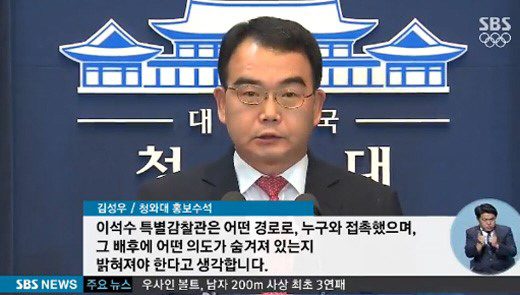 김성우 청와대 홍보수석은 19일 춘추관에서 이석수 특별감찰관이 한 언론사에 감찰내용을 유출했다는 의혹 보도와 관련해 "사실이라면 중대한 위법행위"라고 밝혔다.