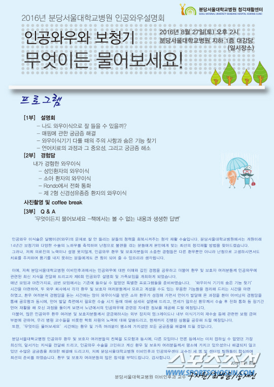 분당서울대병원(원장 전상훈)은 오는 27일 오후 2시 지하 1층 대강당에서 이비인후과 청각재활센터가 주최하는 '2016 인공와우 가족모임 및 설명회'가 열린다고 밝혔다. 이날 오후 2시부터 5시까지 약 3시간 동안 인공와우 이식술을 받은 환우 및 보호자, 그리고 인공와우 수술이 필요한 난청 환자들이 모여 그동안 인공와우를 사용하면서 궁금하거나 힘들었던 점과 유용한 정보 등을 서로 공유할 예정이다.