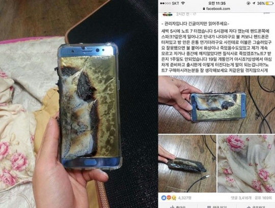 인터넷 커뮤니티 '뽐뿌'에서 삼성 프리미엄 스마트폰 신제품 갤럭시노트7이 충전 중 폭발했다는 주장이 제기된 가운데, 삼성 측이 "제품을 회수해 검토 중"이라고 밝혔다.