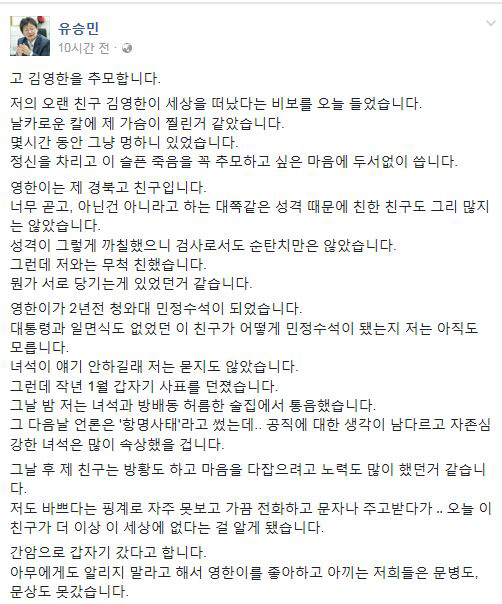 김 전수석의 별세 소식에 경북고 동창이자 동갑내기 동료인 유승민 새누리당 의원은 25일 새벽 자신의 페이스북을 통해 장문의 추모사를 남겼다.