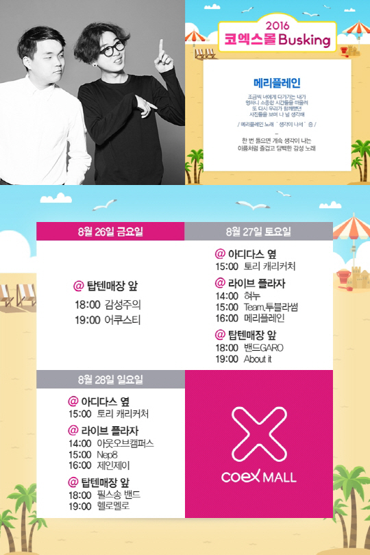 버스킹 공연은 코엑스몰 주요 광장에서 상시적으로 진행되는 문화공연의 일환으로, 주말 공연은 27일부터 양일간 오후 2시부터 7시까지 진행된다. 국내 인디밴드들의 공연과 함께 국악, 비트박스, 팝 공연 등으로 구성됐다. 코엑스몰 버스킹 공연 관람은 무료다.