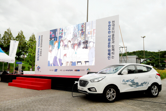 현대자동차 연합동호회 '현대모터클럽'이 현대자동차와 함께 지난 27일 경기도 과천 서울대공원 분수대 광장에 이동식 스크린을 설치하고 시청각장애인을 위한 '배리어프리 영화관'을 열었다.