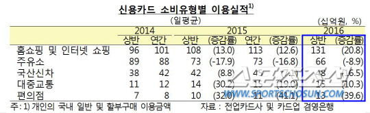 신용카드의 소비유형별 이용실적 중 금액은 홈쇼핑 및 인터넷쇼핑이 1310억원으로 가장 많았고, 이어 주유소가 660억원, 국산 신차는 480억원, 대중교통이 150억원, 편의점이 130억원 순이다.