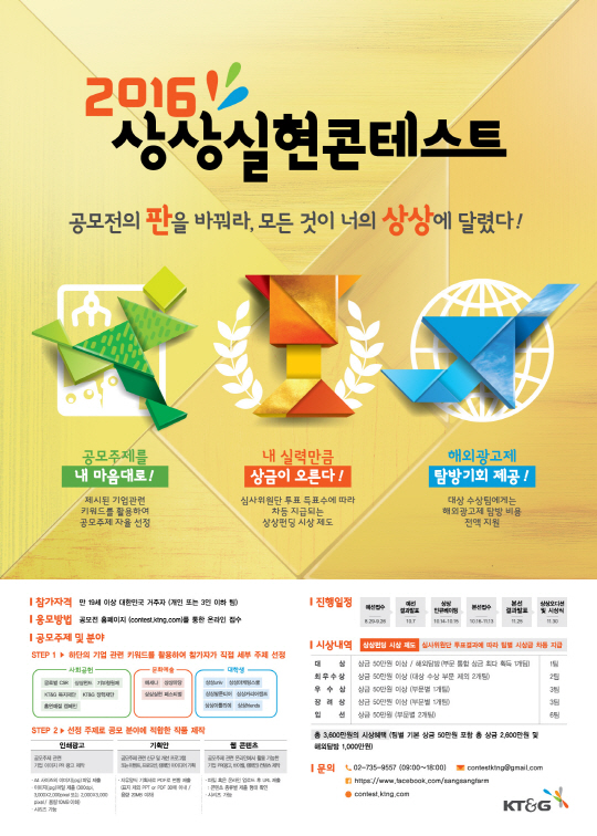 KT&G는 참가자가 직접 공모 주제를 선정해 작품을 제작하는 '2016 상상실현 콘테스트'를 개최한다.