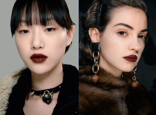 : 다양한 텍스처의 검붉은 컬러를 정교하게 가득 채운 립 메이크업