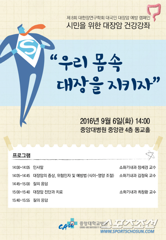 중앙대학교병원이 오는 9월 6일 오후 2시부터 병원 중앙관 4층 동교홀에서 '대장암 건강강좌'를 개최한다.