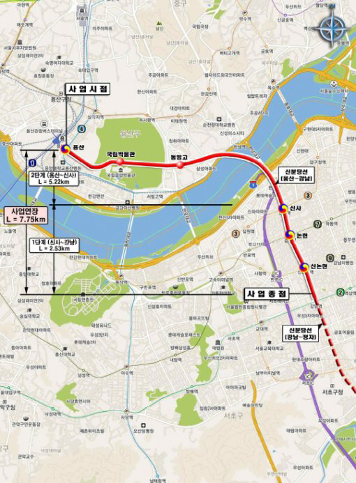 2단계는 용산 미군기지를 통과하는 한강 북측구간(용산∼신사)으로, 용산 미군기지 이전이 확정된 이후 추진된다. <스포츠조선닷컴>