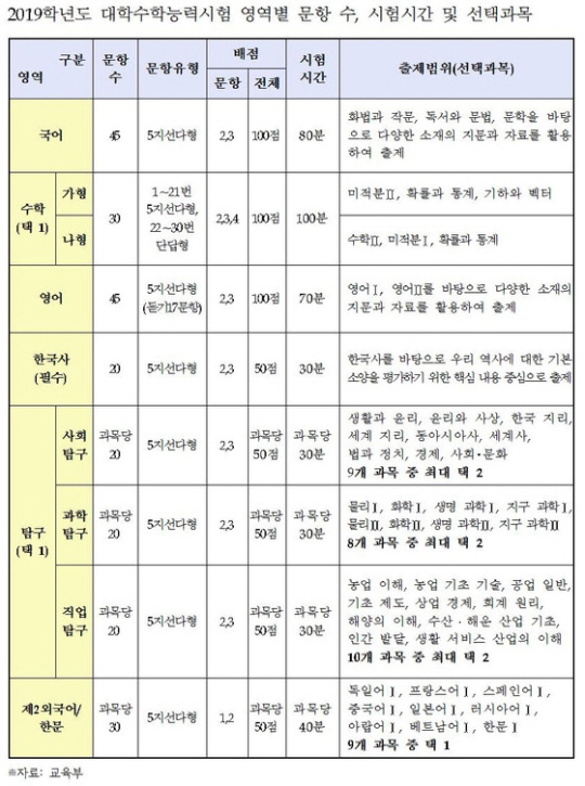 30일 교육부가 발표한 '2019학년도 대학수학능력시험 기본계획'에 따르면 2019학년도 수능시험은 체제 지난해 발표한 2018학년도 수능시험과 변화 없이 동일하게 유지된다. 시험영역은 국어, 수학, 영어, 한국사, 탐구(사회탐구/과학탐구/직업탐구), 제2외국어/한문 영역으로 구분된다.