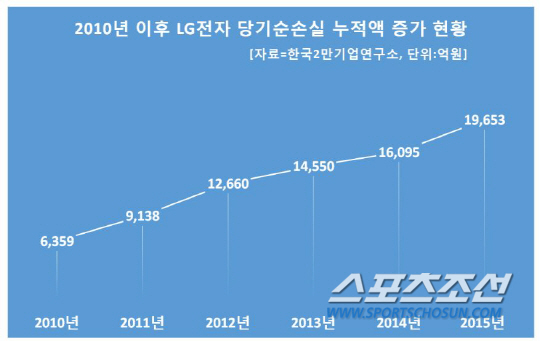 LG전자는 작년 말 기준 영업적자 175억원, 당기순손실액 3558억원의 초라한 성적을 거뒀다. 이중 당기순손실은 지난 2010년부터 2015년까지 매년 마이너스를 기록 중이다. 지난 6년간 누적된 당기순손실 금액만 1조9679억원에 달한다. 이 기간 부채는 3조8564억원 더 증가했다.