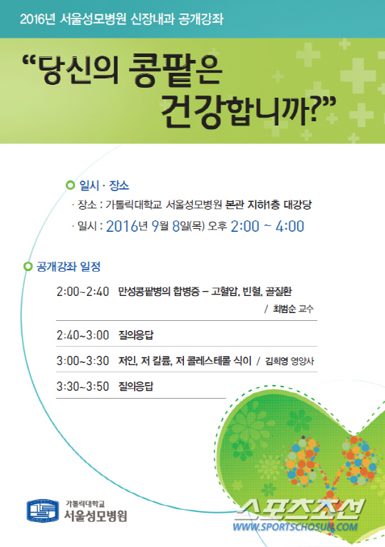 서울성모병원(병원장 승기배 교수)은 오는 8일 오후 2시부터 약 2시간 동안 병원 본관 지하1층 대강당에서 환자 및 일반인을 대상으로 만성콩팥병 공개강좌를 실시한다고 밝혔다. 이번 강좌는 서울성모병원 신장내과와 영양팀이 매년 환자 수가 증가하고 있는 만성콩팥병의 예방과 치료 및 관리에 대한 정보를 제공하기 위해 마련됐다. 강좌는'만성콩팥병의 합병증 - 고혈압, 빈혈, 골질환'(신장내과 최범순 교수)와 '저인, 저 칼륨, 저 콜레스테롤 식이'(김희영 영양사)로 구성되며, 해당 강좌 후 질의응답 시간을 가질 예정이다.