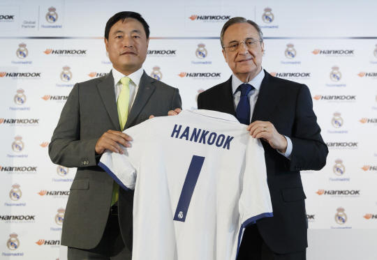 한국타이어는 지난달 31일 스페인의 명문 축구단 레알 마드리드의 홈구장인 스페인 산티아고 베르나베우(Santiago Bernabeu) 경기장에서 레알 마드리드와의 글로벌 마케팅 파트너십 조인식을 가졌다.