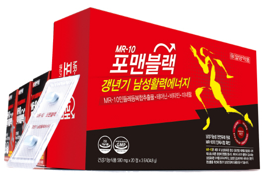 한편 일양약품은 'MR-10'을 주원료로 하는 '포맨블랙'을 출시했다. 하루에 한번만 섭취해도 남성갱년기 증상을 개선하여 성기능 향상, 근지구력 향상, 우울감 및 무기력감 회복 등의 효과를 볼 수 있다. 또한 '포맨블랙' 에는 비타민 B2, B6, C, D와 체내 에너지 생성에 필요한 '나이아신', 면역기능 및 정자생성, 운동성향상에 도움을 주는 '아연'에 남성력 회복에 좋은 홍삼, 마카, 산수유까지 들어있어 갱년기증상으로 괴로운 남성들에게 좋은 해결책이 될 것이다.