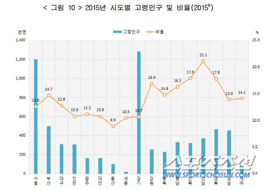 우리나라 모든 시도의 고령인구 비율이 7%가 넘어 고령화사회에 진입한 가운데 특히, 전남(21.1%)은 전체 인구의 20% 이상이 65세가 넘는 초고령사회에 도달했다. 전북(17.9%), 경북(17.8%), 강원(16.9%), 충남(16.3%) 등도 이미 고령사회(65세 이상 인구 14% 이상)를 넘어 초고령사회 진입이 멀지 않은 것으로 나타났다.