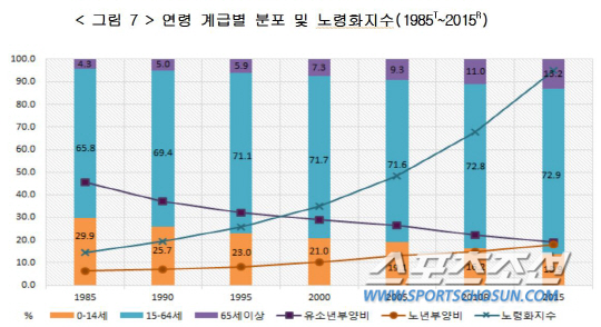 문제는 유소년 인구는 감소하고 중년 이상 특히, 고령인구만 급격히 늘어나고 있다는 점이다. 지난해 11월 1일 기준 유소년인구(0∼14세)는 691만명(13.9%)으로 2010년 788만명(16.2%) 대비 97만명(2.3%포인트) 감소했다. 반면, 65세 이상 고령인구는 657만명(13.2%)으로 2010년 536만명(11%) 대비 121만명(2.2%포인트) 늘었다. 이에 따라 유소년인구에 대한 고령인구의 비율인 노령화지수도 2010년 68.0에서 2015년 95.1로 급상승했다. 생산연령인구 100명에 대한 고령인구 비율을 뜻하는 노년부양비 역시 2010년 15.1에서 2015년 18.1로 높아졌다.