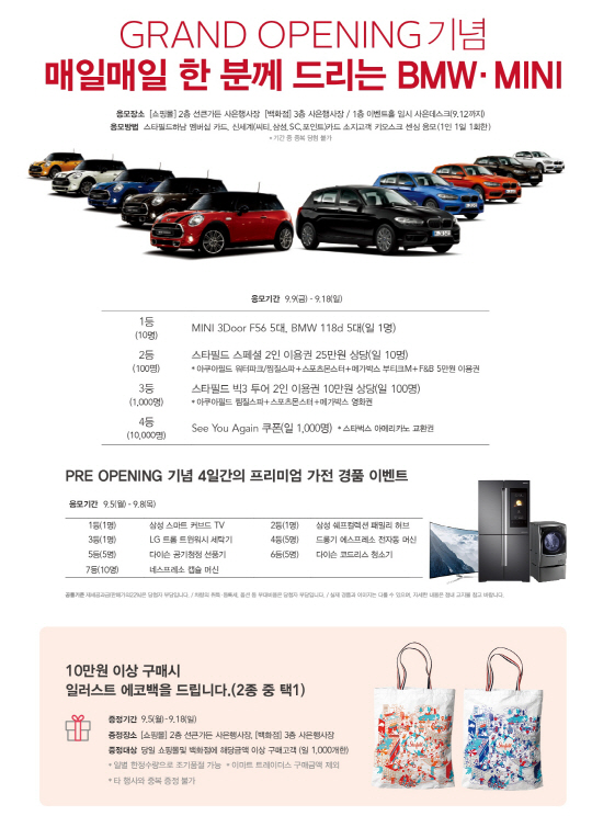 가장 눈길을 끄는 것은 18일까지 진행되는 총 5억원 상당의 경품 이벤트다. 매일 1등에게는 MINI 3Door F56 또는 BMW 118d를 지급하는 등 열흘간 총 10대의 BMW/MINI 자동차가 경품으로 제공된다. 적용대상은 스타필드 하남 멤버십 카드 또는 신세계(씨티, 삼성, SC, 포인트)카드 소지고객이며, 해당 카드의 키오스크 센싱을 통해 응모하게 되면 즉시 당첨여부를 확인할 수 있다. (응모장소 : 2층 선큰가든 사은행사장, 백화점 3층 사은행사장 등)