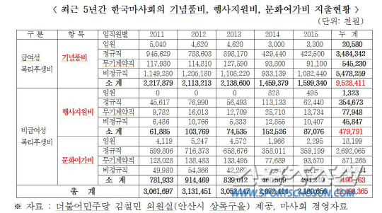 김철민 국회 농림축산식품해양수산위원회 소속 더불어민주당 의원은 12일 마사회의 경영자료를 분석한 결과 2011년부터 지난해까지 5년 동안 임직원들에게 각종 기념품비로 95억2841만원을 지급했다고 밝혔다.