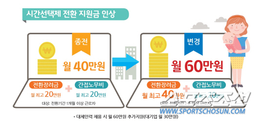 임신기 근로시간 단축 등 전환형 시간선택제 도입 및 운영 사업주에 대한 정부 지원금이 지난 1일 전환근로자부터 1인당 월 최고 40만원에서 60만원으로 인상 적용된다.