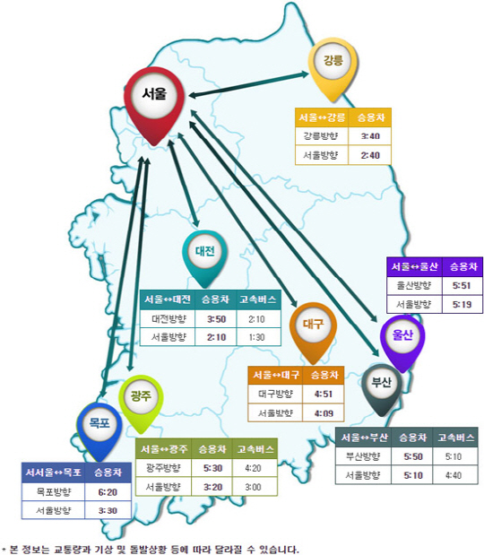 낮 12시 승용차 기준으로 서울에서 주요 도시까지 예상 소요시간은 부산 5시간 50분, 대구 4시간 51분, 울산 5시간 51분, 대전 3시간 30분, 광주 5시간, 목포 6시간 20분, 강릉 3시간 40분이다.