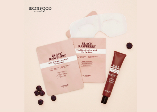 스킨푸드 신제품 복분자 아이 케어 2종은 복분자 추출물과 12가지 한방약초 영양 성분으로 눈가 피부 관리에 도움을 주는 토털 안티에이징 케어 라인이다. 튜브 타입의 복분자 아이크림 포 페이스와 고글 모양의 아이 마스크 시트 복분자 토털 링클 케어 마스크 포 아이존으로 구성되어 있다. 특히 복분자 아이 마스크는 크림 믹싱 하이드로겔 성분으로 더욱 촉촉하고 시원한 사용감과 함께 깊고 풍부한 보습 효과를 선사한다.