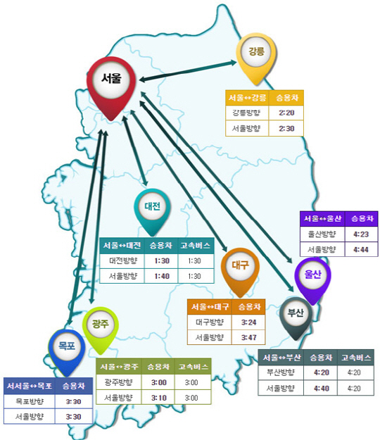 광주에서는 3시간10분, 대구에서 3시간47분, 대전에서 1시간40분, 강릉에서 2시간30분이 걸릴 것으로 전망됐다.